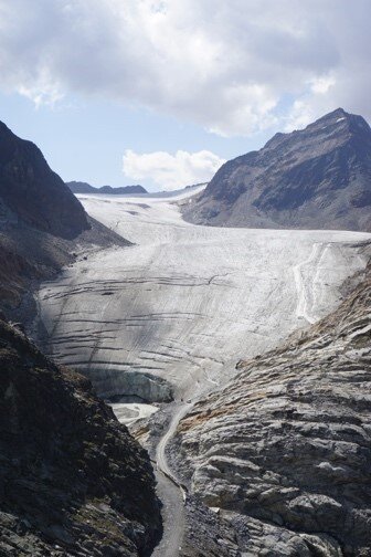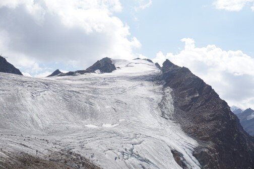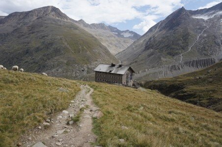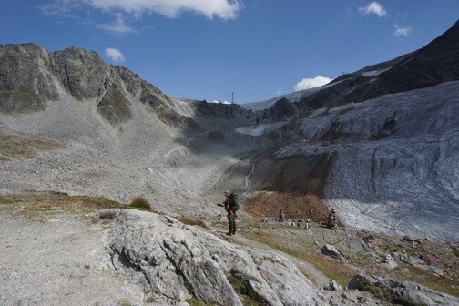 Schlussendlich auf der Braunschweiger Hütte ging es für uns nach kurzer Stärkung wieder weiter, da wir im Vorfeld schon abgeklärt hatten, dass wir mit Hund leider keine Chance auf eine Übernachtungsmöglichkeit auf der Hütte haben sollten und demzufolge weiter nach Vent mussten. Mit unserem heutigen Ziel, das Hotel Similaun, lagen ja noch einige Stunden Fußmarsch vor uns. So sind wir dann zügig weiter über das Rettenbachjoch und anschließend ohne Pause und weitere Fotos über den Panoramaweg nach Vent.