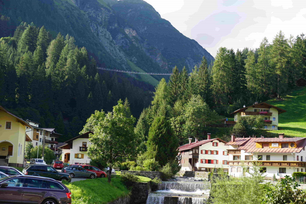 - Blick zurück aus Holzgau auf die Hängebrücke
