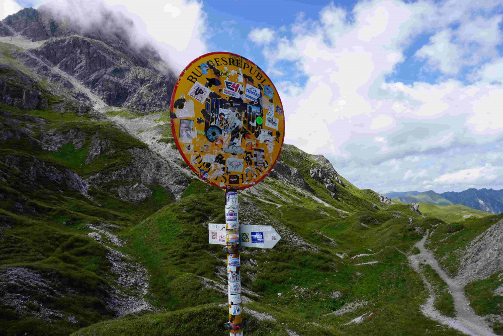 Nach kurzer Strecke war das Mädelejoch erreicht und somit der Grenzstein zwischen Österreich und Deutschland und einem der bekanntesten Fotomotive der Tour.