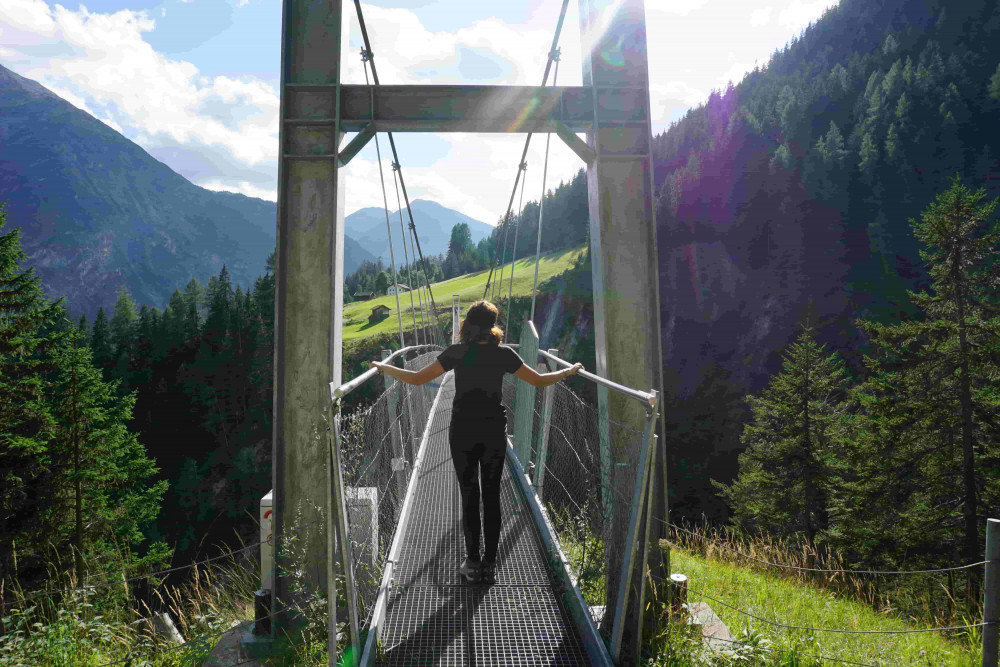Ein paar Erinnerungsfotos später begann der Abstieg in Richtung Lechtal, hinab nach Holzgau. Zunächst steil bergab über teils nachrutschendes Geröll, anschließend weniger steil über befestigte Wege in Richtung des bekannten Cafe Uta. Beim Cafe Uta angelangt muss man sich entscheiden, rechts zum Simms-Wasserfall oder links hinauf zur Hängebrücke. Wir hatten uns bereits vorher für die Hängebrücke entschieden die wir wenige Minuten später erreichten. Über die schwingende Stahlkonstruktion ging es auf die andere Seite und im Anschluss in den Ortskern von Holzgau.