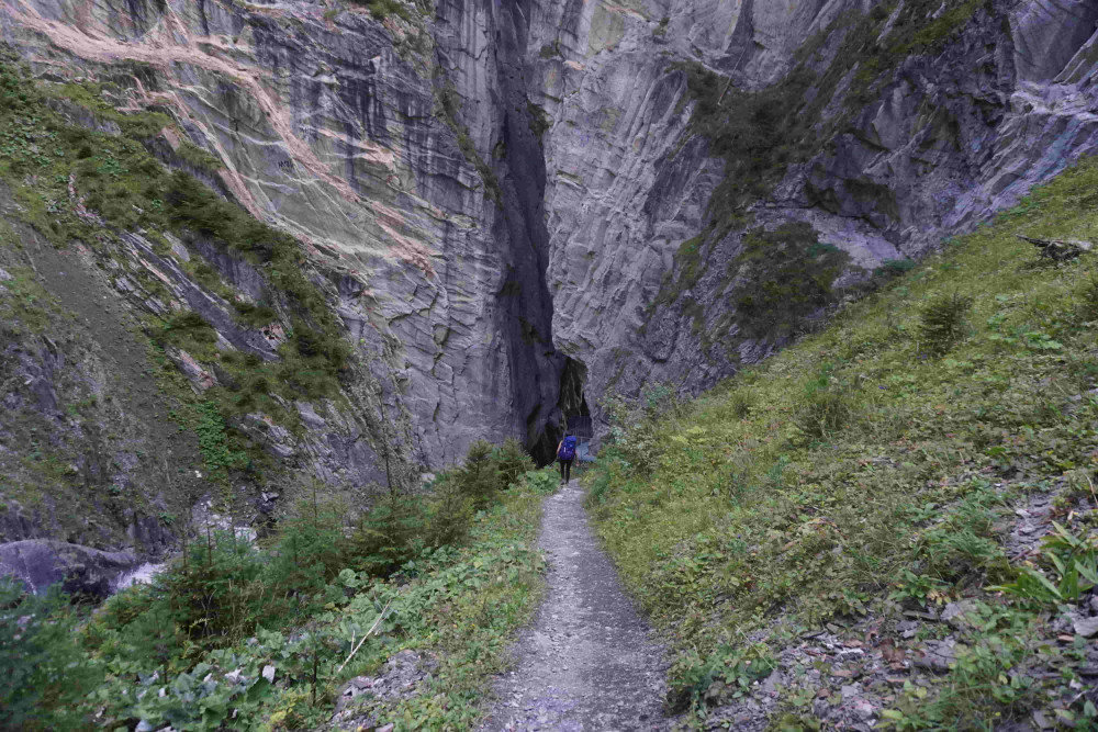 Von der Spielmannsau aus ging es Richtung erstes Zwischenziel zur Kemptner Hütte. Der Weg führte uns erst ebenerdig durch kleinhügelige saftig grüne Kuhweiden zur Materialseilbahn der Kemptner Hütte. Mit der Materialseilbahn ließen wir auch die ebene Streckenführung hinter uns, ab jetzt begann der Aufstieg. Zunächst noch bei moderater Steigung, ging es durch schattenspendenden Wald, anschließend, nach Überquerung des Sperrbachs über eine Brücke, stieg es steil an Richtung Kapelle Maria am Knie, teilweise wurde der Aufstieg aber durch Stufen erleichtert. Anschließend ging es das letzte Stück durch den Sperrbachtobel weiter bergauf an kleinen Sturzbächen und Wasserfällen vorbei, die dank Seilversicherungen trotz Nässe sicher zu begehen waren.