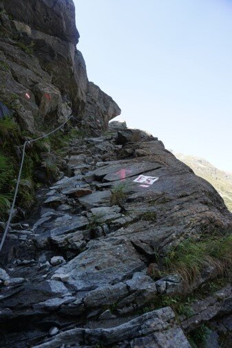 In Mittelberg angekommen und ganz beschwingt vom schwerelosem Gefühl auf dem Rücken, dank Materialseilbahn, ging es mit dem Nötigsten bepackt in Richtung Braunschweiger Hütte, dem für uns im Nachhinein wohl anstrengendsten Aufstieg auf der gesamten Route. Dies war auch die einzige Etappe in der wir Capper über weite Teile tragen mussten, da wir befürchten mussten, dass die ständigen Vorsprünge aus Fels zu viel für seine Gelenke sein könnten. Somit hatte Capper dann heute mehr oder weniger einen Ruhetag und konnte die Aussicht aus seinem Tragerucksack genießen.