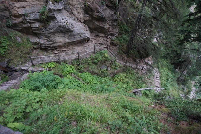 Über das Flarschjoch ging es weiter zur Ansbacher Hütte und von dort aus nahmen wir den vermutlich nicht weniger strapazierenden Abstieg (ca. 1200Hm) über die Fritz Hütte hinab ins Tal und weiter durch waldiges Gebiet in Richtung Dorf Schnann und kurz vor dessen Erreichen noch durch die gleichnamige Klamm. Von Schnann aus ging es für uns mit dem Bus zurück auf die geplante Route nach Zams.